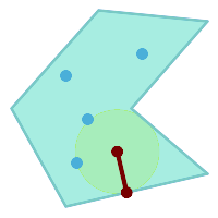 Finds the largest circle which does not overlap a set of point and line obstacles. (Polygonal geometries may be included as obstacles, but only their boundary lines are used.) The center of the circle is constrained to lie inside a polygonal boundary, which by default is the convex hull of the input geometry. The circle center is the point in the interior of the boundary which has the farthest distance from the obstacles. The circle itself is provided by the center point and a nearest point lying on an obstacle determining the circle radius.