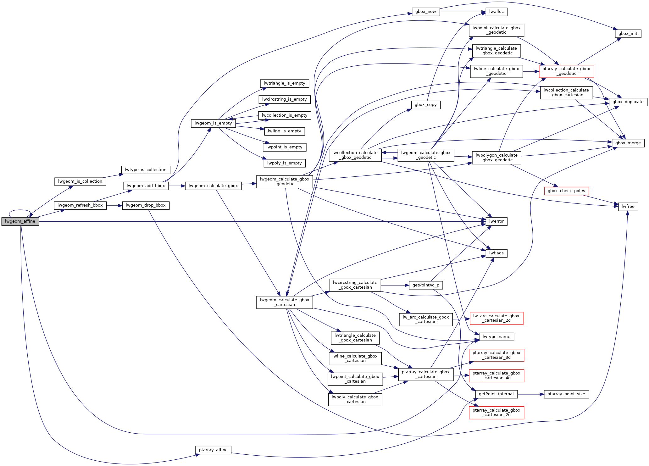 References LWGEOM::bbox, CIRCSTRINGTYPE, CURVEPOLYTYPE, LWCOLLECTION::geoms, LINETYPE, lwerror(), lwgeom_affine(), lwgeom_is_collection(), lwgeom_refresh_bbox(), lwtype_name(), LWCOLLECTION::ngeoms, LWPOLY::nrings, LWCURVEPOLY::nrings, LWLINE::points, POINTTYPE, POLYGONTYPE, ptarray_affine(), LWPOLY::rings, LWCURVEPOLY::rings, TRIANGLETYPE, LWGEOM::type, and ovdump::type.