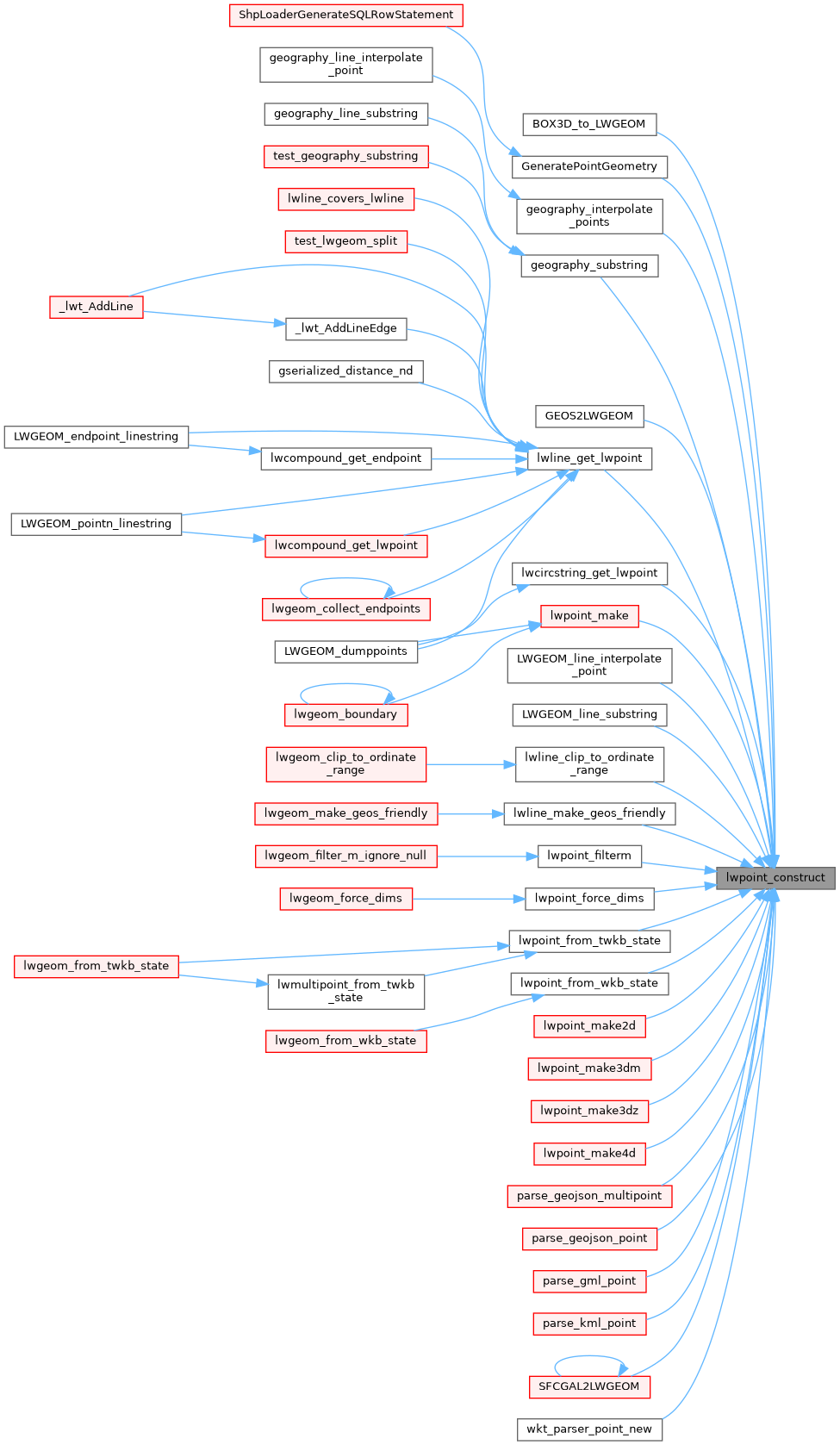 Referenced by BOX3D_to_LWGEOM(), GeneratePointGeometry(), geography_interpolate_points(), geography_substring(), GEOS2LWGEOM(), lwcircstring_get_lwpoint(), LWGEOM_line_interpolate_point(), LWGEOM_line_substring(), lwline_clip_to_ordinate_range(), lwline_get_lwpoint(), lwline_make_geos_friendly(), lwpoint_filterm(), lwpoint_force_dims(), lwpoint_from_twkb_state(), lwpoint_from_wkb_state(), lwpoint_make(), lwpoint_make2d(), lwpoint_make3dm(), lwpoint_make3dz(), lwpoint_make4d(), parse_geojson_multipoint(), parse_geojson_point(), parse_gml_point(), parse_kml_point(), SFCGAL2LWGEOM(), and wkt_parser_point_new().