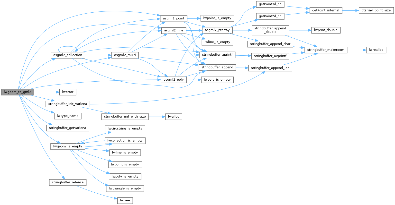 References asgml2_collection(), asgml2_line(), asgml2_multi(), asgml2_point(), asgml2_poly(), COLLECTIONTYPE, LINETYPE, lwerror(), lwgeom_is_empty(), lwtype_name(), MULTILINETYPE, MULTIPOINTTYPE, MULTIPOLYGONTYPE, POINTTYPE, POLYGONTYPE, POLYHEDRALSURFACETYPE, precision, GML_Options::precision, GML_Options::prefix, GML_Options::srs, stringbuffer_getvarlena(), stringbuffer_init_varlena(), stringbuffer_release(), TINTYPE, TRIANGLETYPE, LWGEOM::type, and LWPOINT::type.