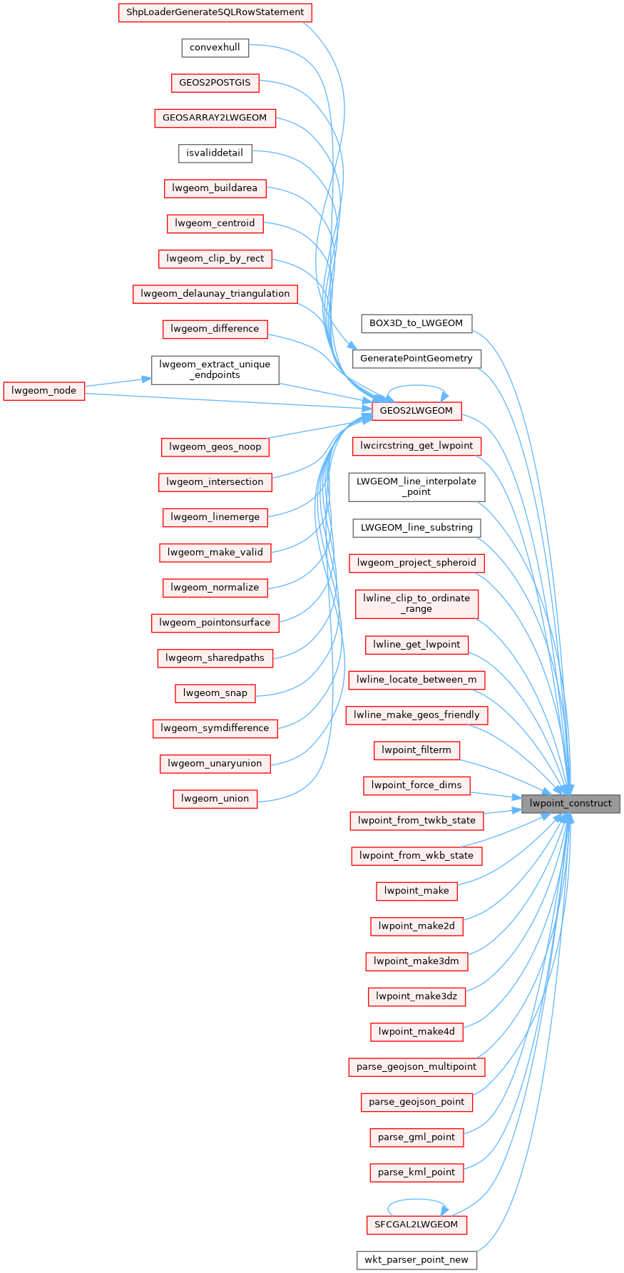 Referenced by BOX3D_to_LWGEOM(), GeneratePointGeometry(), GEOS2LWGEOM(), lwcircstring_get_lwpoint(), LWGEOM_line_interpolate_point(), LWGEOM_line_substring(), lwgeom_project_spheroid(), lwline_clip_to_ordinate_range(), lwline_get_lwpoint(), lwline_locate_between_m(), lwline_make_geos_friendly(), lwpoint_filterm(), lwpoint_force_dims(), lwpoint_from_twkb_state(), lwpoint_from_wkb_state(), lwpoint_make(), lwpoint_make2d(), lwpoint_make3dm(), lwpoint_make3dz(), lwpoint_make4d(), parse_geojson_multipoint(), parse_geojson_point(), parse_gml_point(), parse_kml_point(), SFCGAL2LWGEOM(), and wkt_parser_point_new().