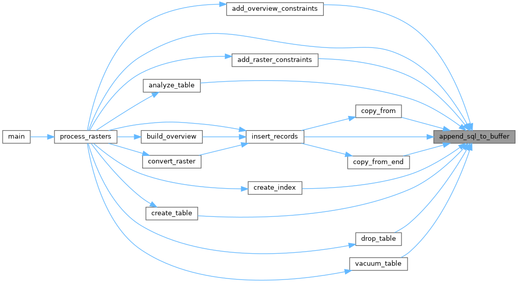 Referenced by add_overview_constraints(), add_raster_constraints(), analyze_table(), copy_from(), copy_from_end(), create_index(), create_table(), drop_table(), insert_records(), process_rasters(), and vacuum_table().