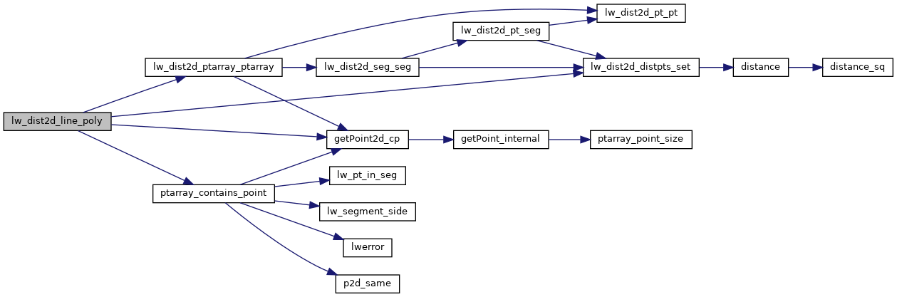 References DIST_MAX, DIST_MIN, DISTPTS::distance, getPoint2d_cp(), lw_dist2d_distpts_set(), lw_dist2d_ptarray_ptarray(), LW_FALSE, LW_OUTSIDE, LW_TRUE, DISTPTS::mode, LWPOLY::nrings, LWLINE::points, ptarray_contains_point(), LWPOLY::rings, and DISTPTS::tolerance.