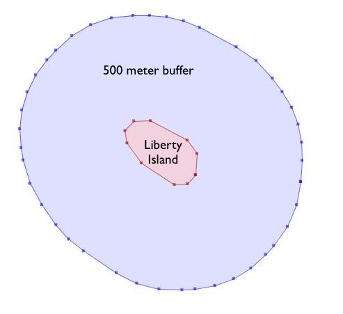 For example, if the US Park Service wanted to enforce a marine traffic zone around Liberty Island, they might build a 500 meter buffer polygon around the island. Liberty Island is a single census block in our nyc_census_blocks table, so we can easily extract and buffer it.