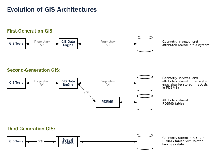 In legacy first-generation GIS implementations, all spatial data is stored in flat files and special GIS software is required to interpret and manipulate the data. These first-generation management systems are designed to meet the needs of users where all required data is within the user’s organizational domain. They are proprietary, self-contained systems specifically built for handling spatial data.
