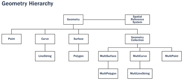 Spatial data types are organized in a type hierarchy. Each sub-type inherits the structure (attributes) and the behavior (methods or functions) of its super-type.