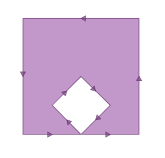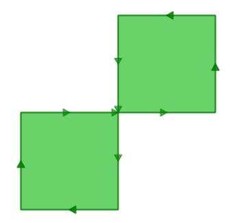 The outer ring is actually a figure-eight, with a self-intersection in the middle. Note that the graphic routines successfully render the polygon fill, so that visually it is appears to be an “area”: two one-unit squares, so a total area of two units of area.